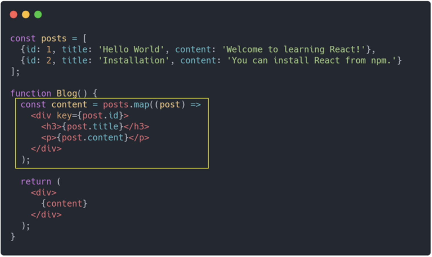 - To display multiple HTML elements in React, use the "map()" function.