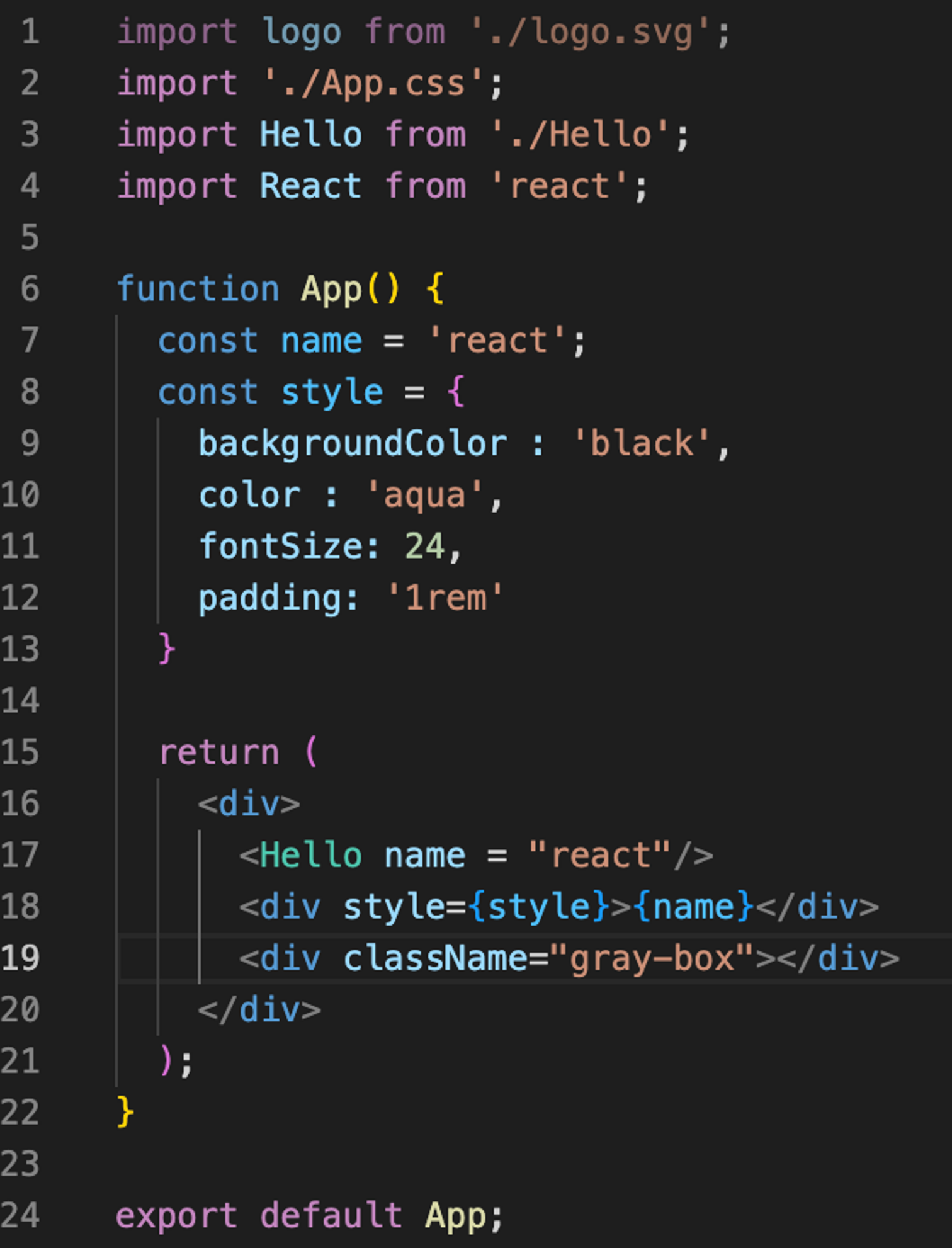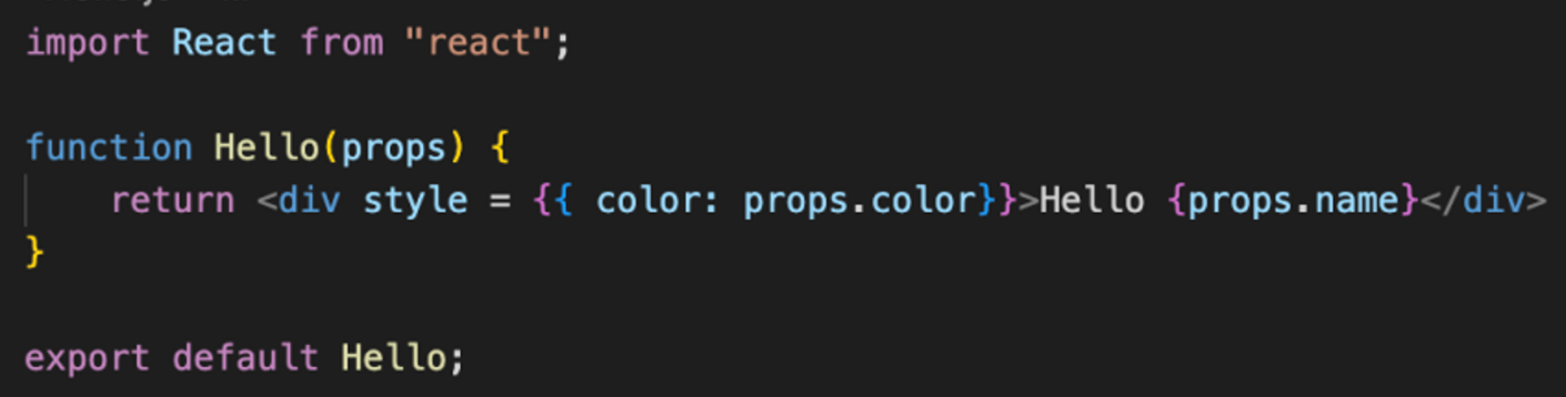 Suppose you want to pass the value 'name' when using the Hello component in the App component. Then, you can write the code like this.