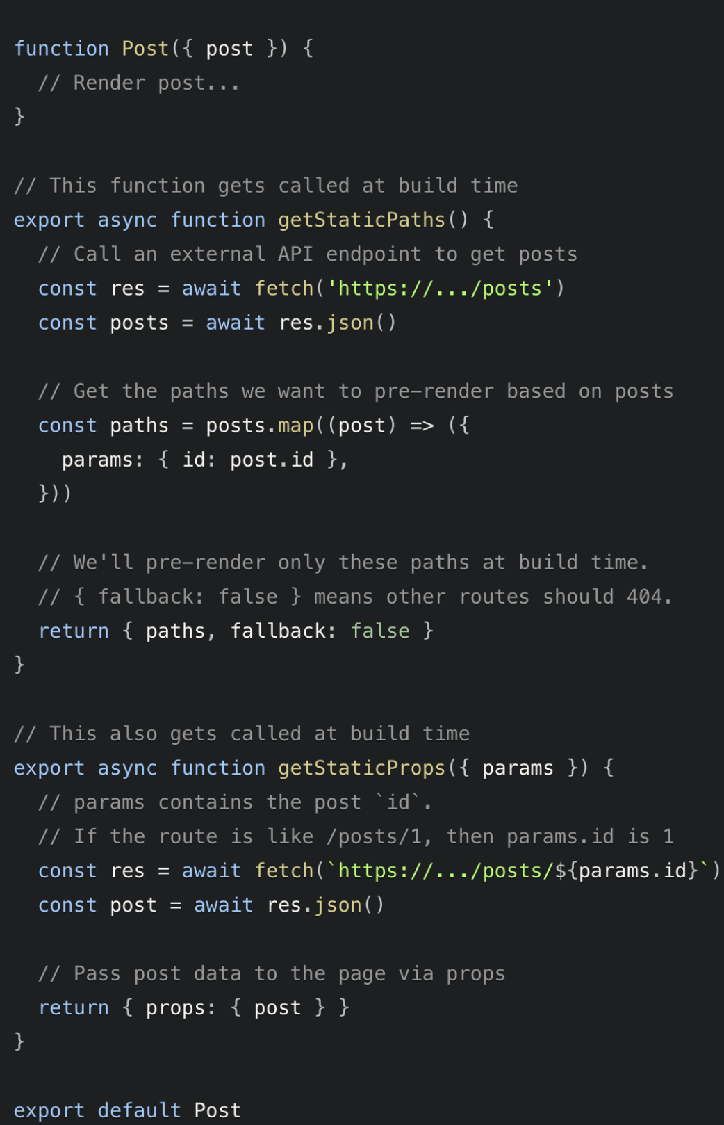 In this example, the getStaticPaths function fetches a list of posts from an API and returns an array of paths that should be pre-rendered. The fallback property is set to true, so if a path is not found, a fallback page will be served.