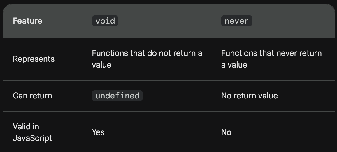 The main difference between void and never is that void allows functions to return undefined, while never does not. This is because undefined is a valid value in JavaScript, while never is not.