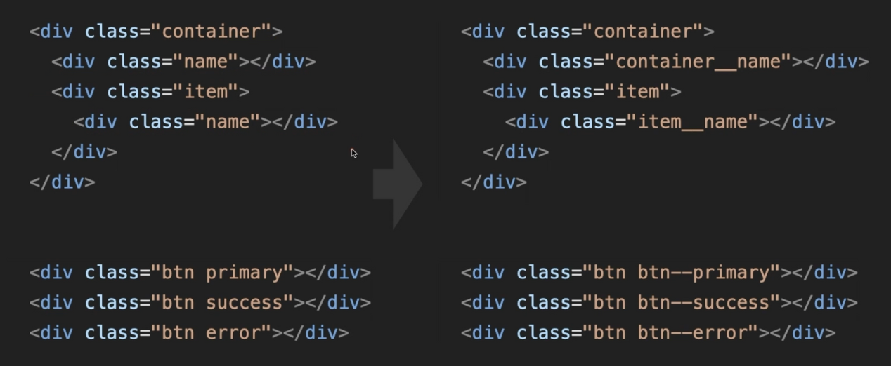 - Block: A block represents a standalone component or a higher-level element that has a meaningful function within the webpage. It is typically a self-contained entity that can be reused across different sections of the site. Block names are written in lowercase and can include hyphens. For example, header, sidebar, button, etc.