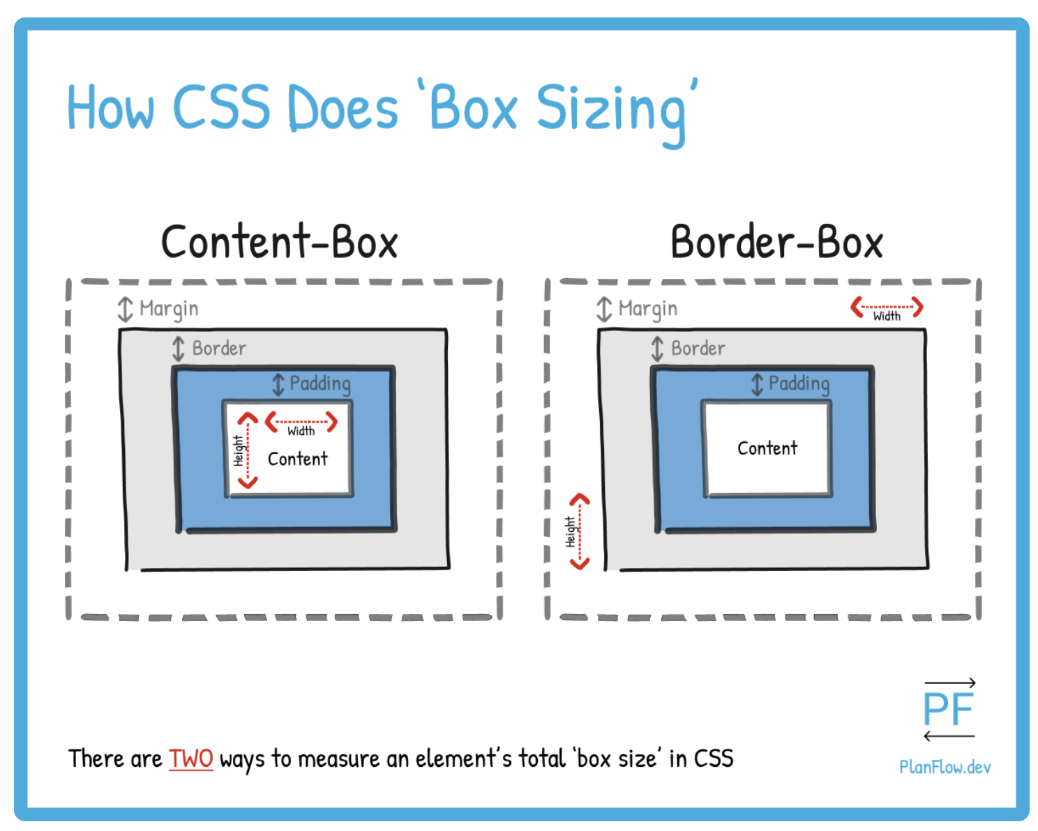 - border-box: This value includes the padding and border within the specified width and height of an element. The total width of the element is equal to the sum of the content width, padding, border, and any specified margins.