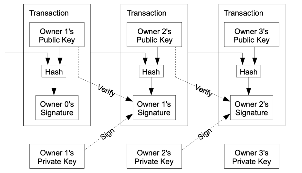 → Each owner transfers the coin to the next by digitally signing a hash of the previous transaction and the public key of the next owner and adding these to the end of the coin. A payee can verify the signatures to verify the chain of ownership.