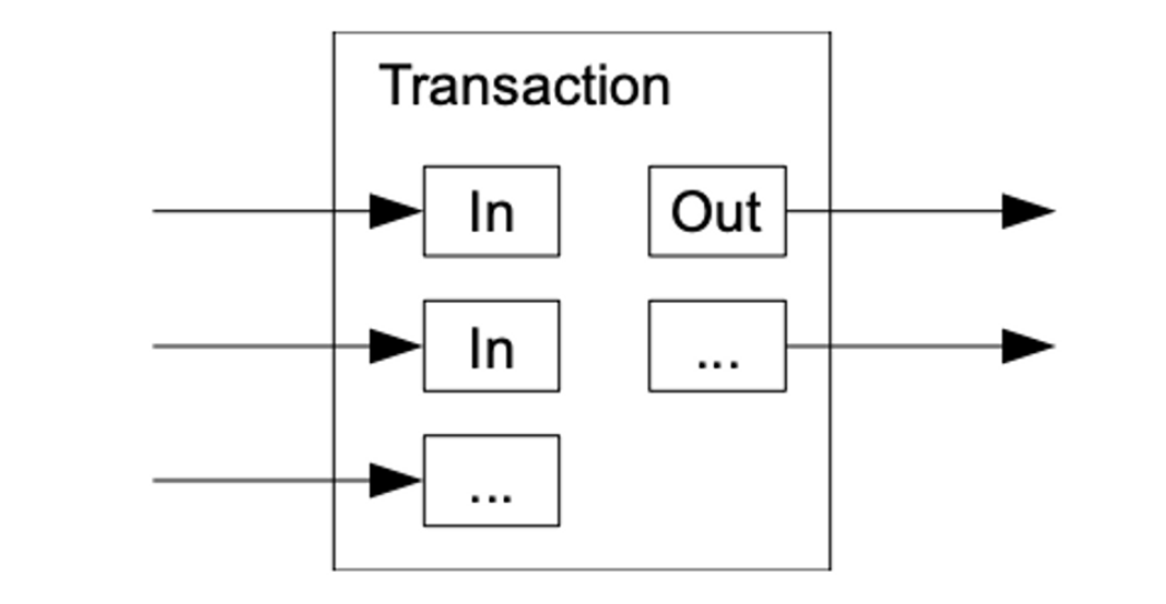 → Normally there will be either a single input from a larger previous transaction or multiple inputs combining smaller amounts, and at most two outputs: one for the payment, and one returning the change, if any, back to the sender.