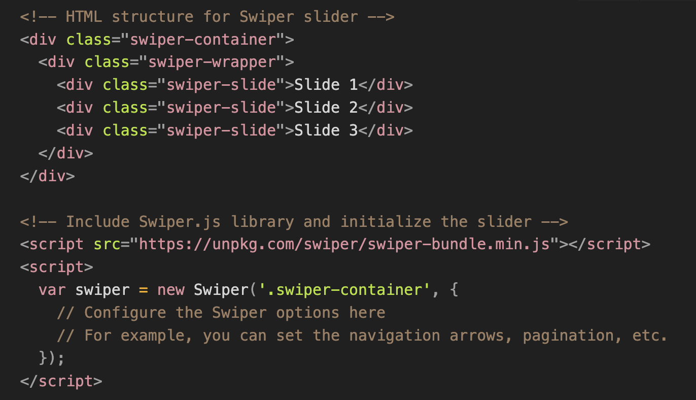 In this example, the HTML structure defines a container with slides, and the JavaScript code initializes the Swiper instance on the container element. You can customize the slider's behavior and appearance by passing the appropriate options to the Swiper constructor.