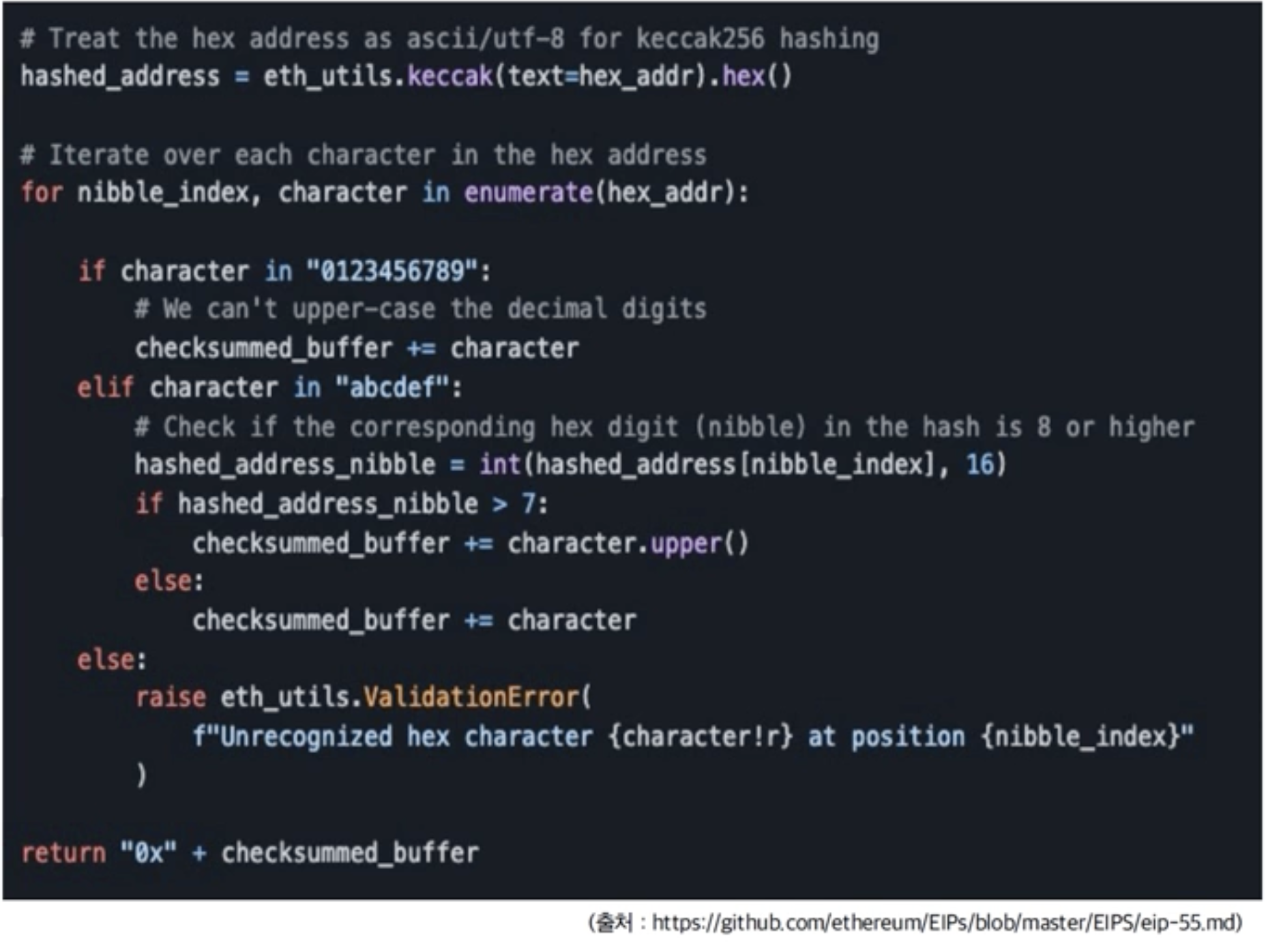 In the case of Ethereum Address, unlike Bitcoin, checksum is not included in the creation process, so it is difficult to check whether the address is accurate. To solve this problem, a checksum function is provided by converting the case of the address through EIP-55.