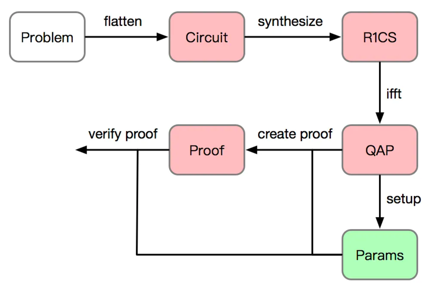 - Verification Process: Using the received proof data and the CRS, the verifier checks the validity of the proof. This involves using the QAP polynomials and the common parameters to ensure the proof is correct.