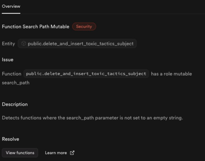 My story begins with a seemingly innocuous PostgreSQL function in our Supabase project. Upon deployment, we were greeted with a warning from the Supabase advisor: